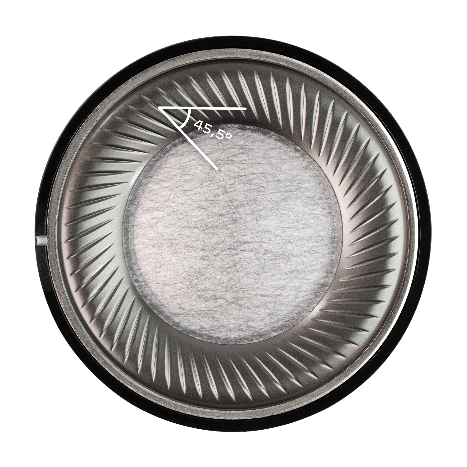 Le tore qui entoure le dôme est constitué d’un polymère semi-cristallin recouvert de titane, conçu pour optimiser la rigidité, la vitesse et l’équilibre tonal. Le revêtement en titane, appliqué par dépôt physique en phase vapeur (PVD), renforce la structure de la membrane tout en lui conservant sa légèreté, pour une réponse transitoire rapide et des basses agréablement texturées. Le tore est doté de rainures positionnées avec précision à un angle de 45,5°, qui contrôlent efficacement les résonances et permettent au haut-parleur de reproduire un son précis et fluide.