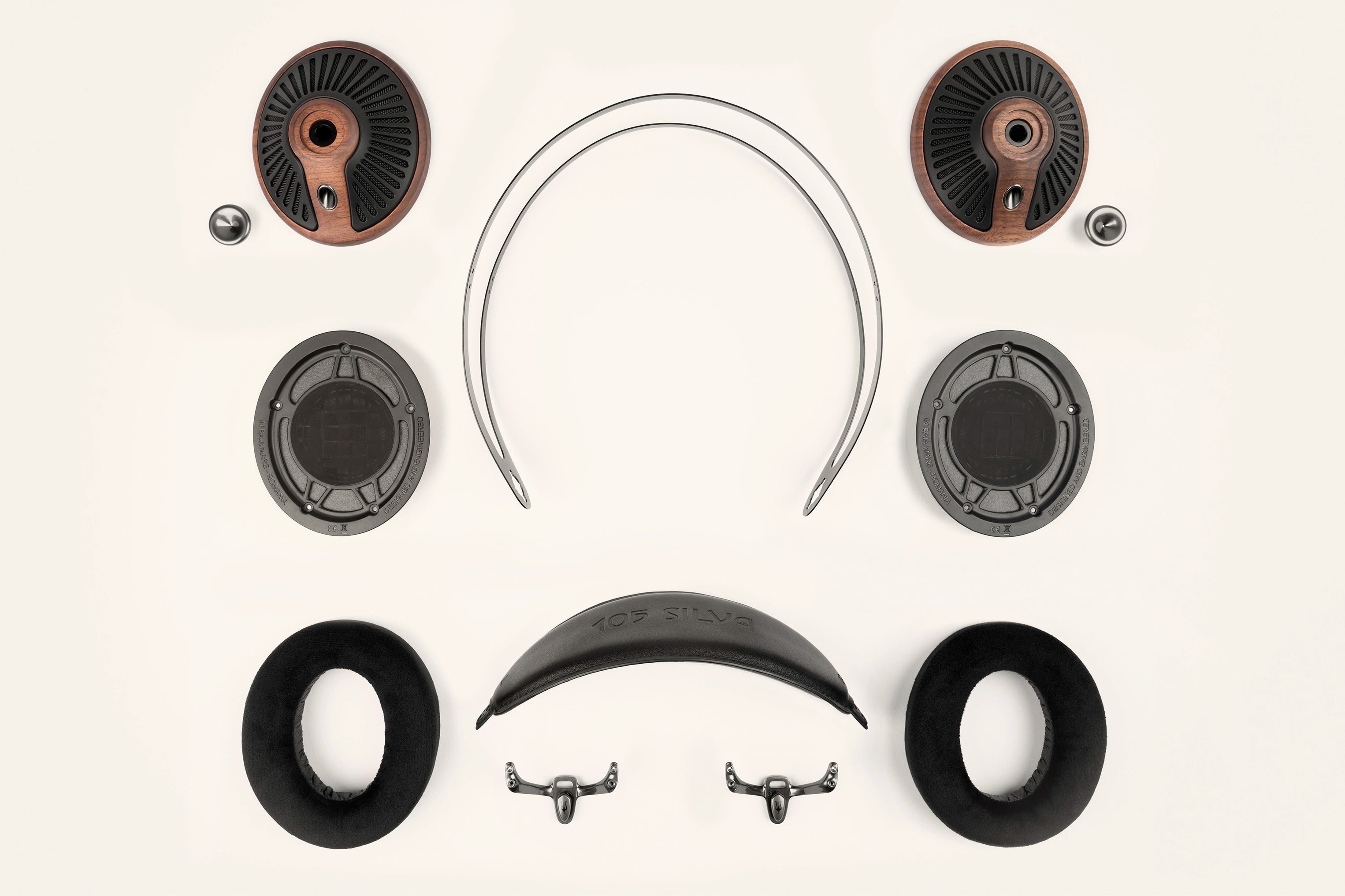 S’inspirant du mouvement Mid-Century Modern, la conception du 105 SILVA respire la sobriété, la fonctionnalité et la durabilité, tout en intégrant harmonieusement des matériaux naturels et modernes. Alliant le vintage au contemporain, la grille radiale s’entremêle subtilement avec le bois de noyer pour former les oreillettes, créant ainsi un style intemporel. Le serre-tête en acier à ressort et les pièces métalliques en alliage de zinc moulé revêtues de PVD relient tous les éléments pour former une structure à la fois robuste et flexible.